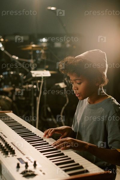 Мальчик-подросток играет на клавиатуре в студии