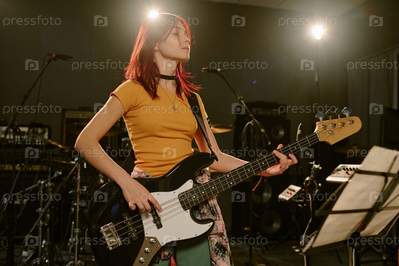Девушка-подросток играет на электрической гитаре в студии