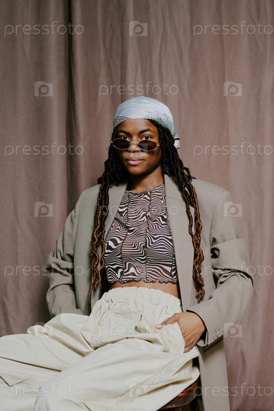 Портрет афроамериканской женщины в стильном наряде, сидящей