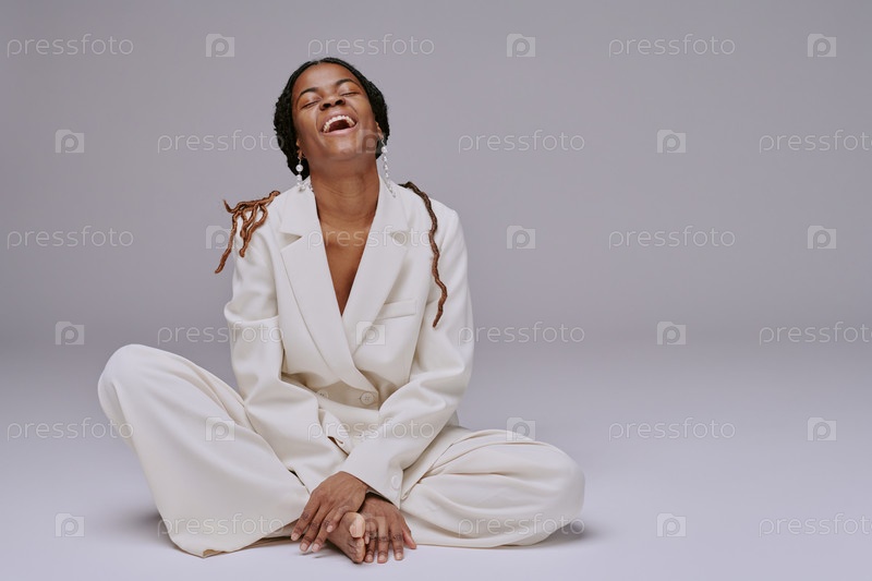 Смех Молодая женщина, сидящая скрещенными ногами в расслабленной позе