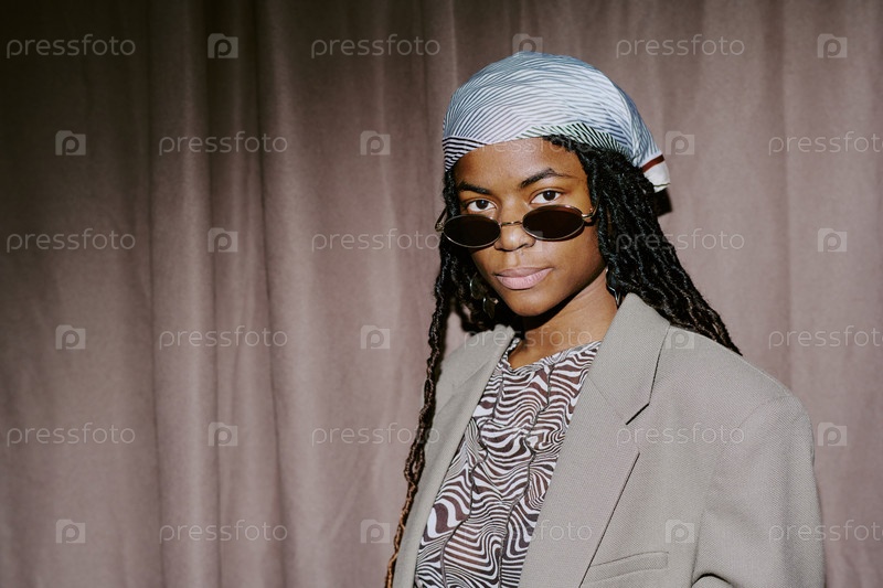 Стильная женщина с солнцезащитными очками и платками позирует в помещении