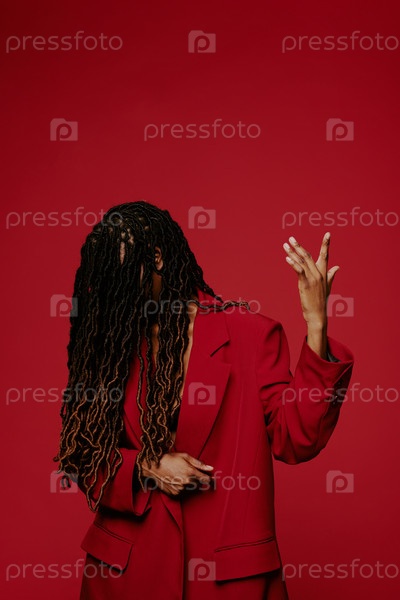 Женщина-африканец в красном костюме позирует стильно