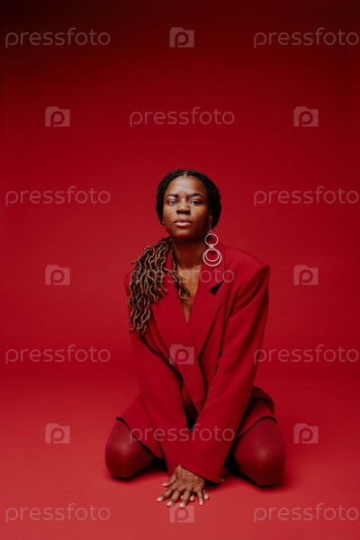 Портрет уверенной женщины на коленях в красном костюме