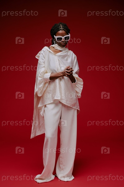 Модная женщина в белом костюме и солнцезащитных очках