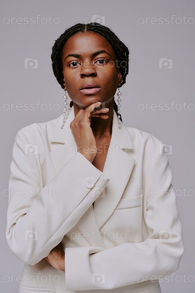Портрет уверенной в себе женщины, одетой в белый костюм и выглядящей продуманно