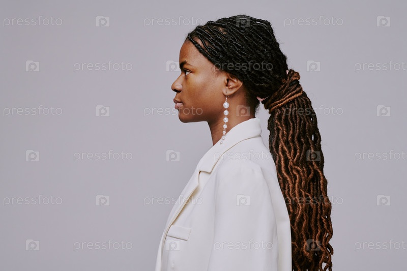 Профиль женщины с длинными сплетёнными волосами и боковыми серьгами
