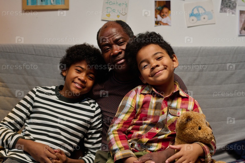 Портрет улыбающейся семьи в уютной обстановке гостиной