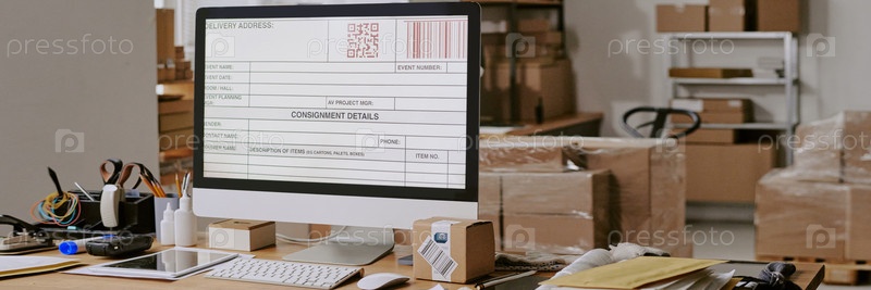Компьютерный монитор отображает этикетку доставки в Office Setting