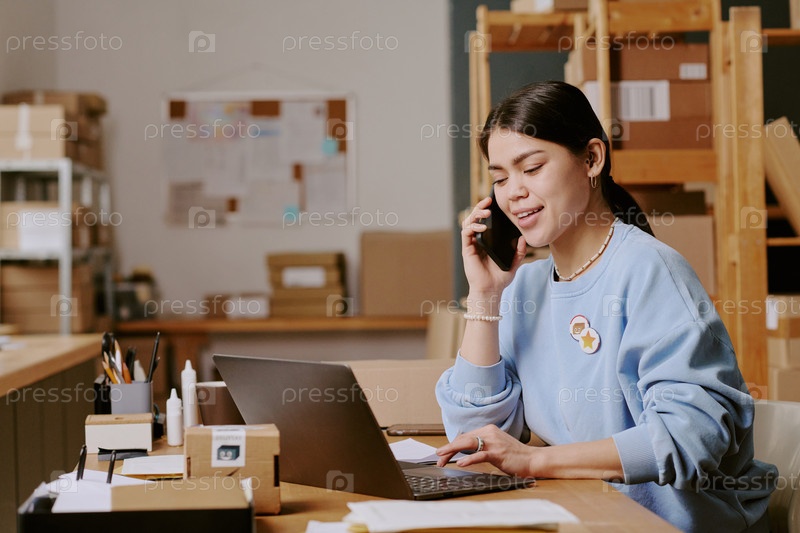 Улыбающаяся женщина разговаривает по телефону на рабочем столе