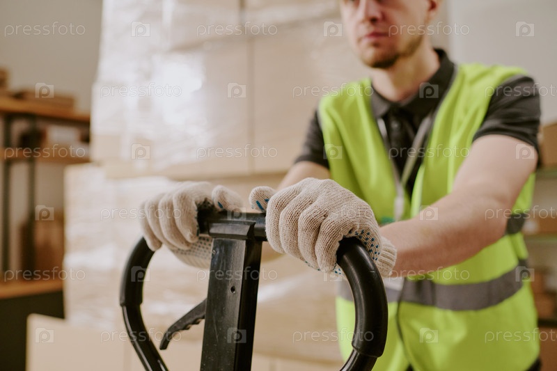 Хранилищный работник перемещает пакеты с Pushcart