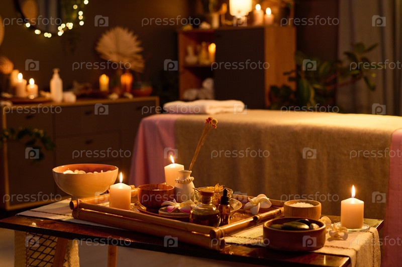 Деревянный стол с ароматическими свечами и оборудованием для массажа