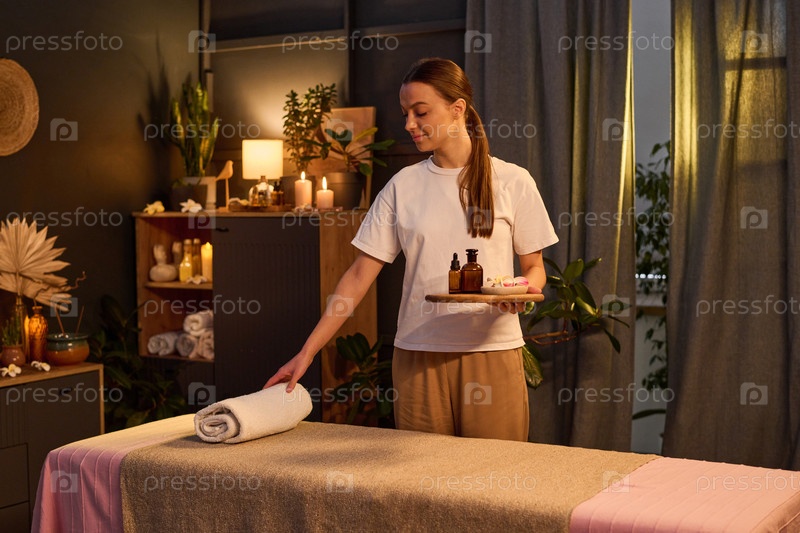 Улыбающаяся массажистка готовит масажный стол