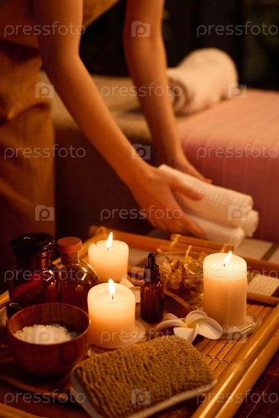 Массажистка готовит кофейный стол для клиента