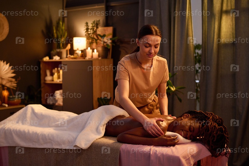 Улыбающийся клиент наслаждается глубоким массажем в спа-салоне