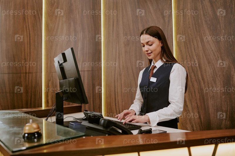 Гостиничный работник печатает на клавиатуре