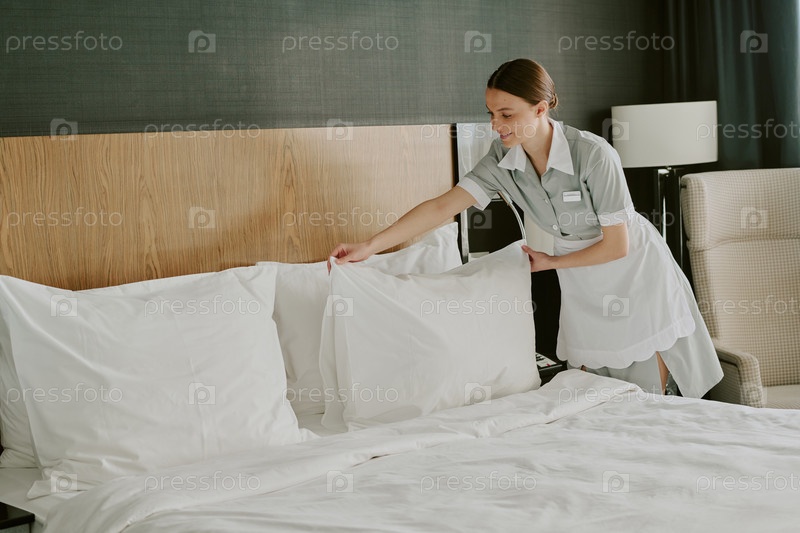 Улыбающаяся горничная, регулирующая подушку