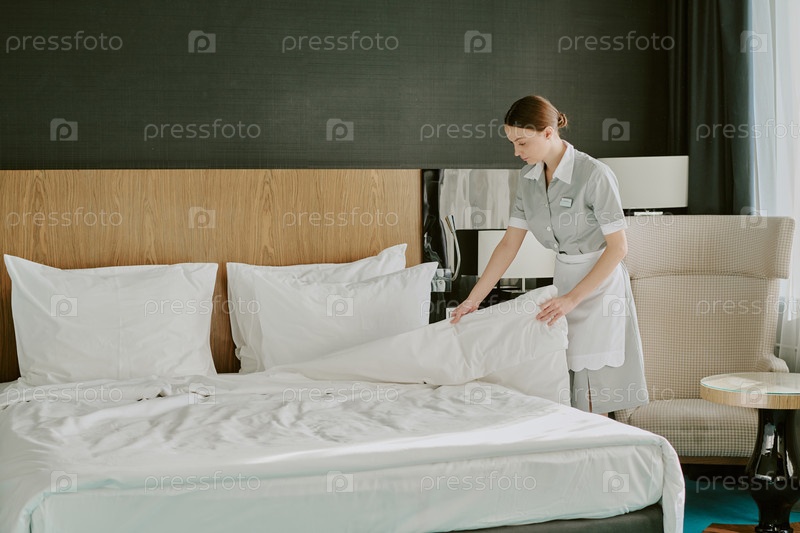Молодая женщина с булочкой прическа освежающая кровать в гостиничном номере