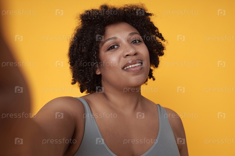 Портрет улыбающейся женщины в сером топе на жёлтом фоне
