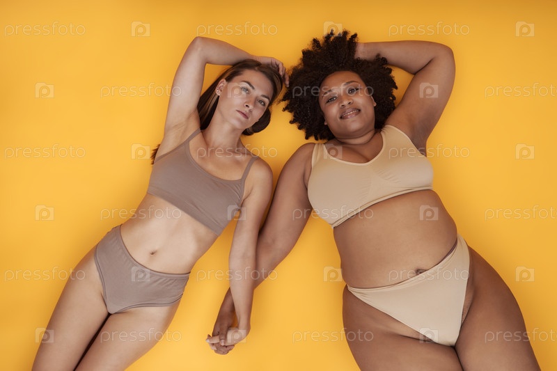 Разнообразные женщины позируют в белье нейтрального цвета на жёлтом фоне