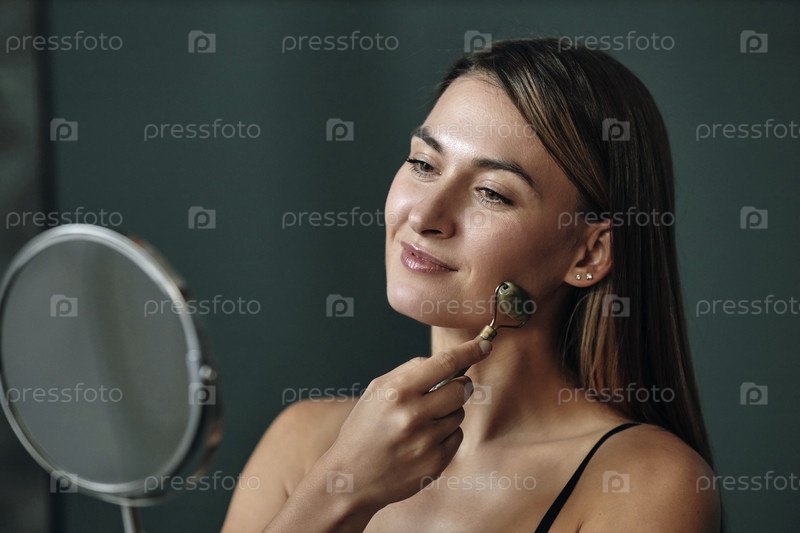 Улыбающаяся женщина наносит макияж перед зеркалом