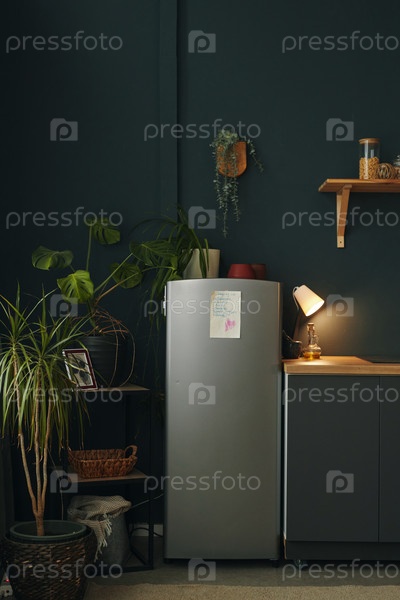 Кухонный дисплей с растениями, холодильником и современным освещением