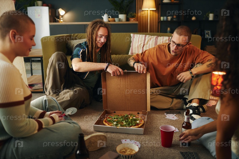 Наслаждаться пиццей с друзьями в уютной обстановке гостиной