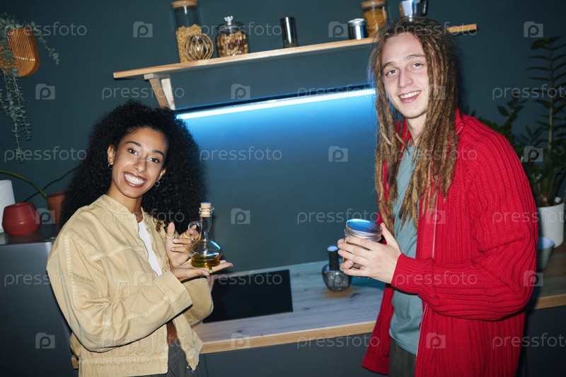 Улыбающиеся друзья наслаждаются напитками в современной кухне
