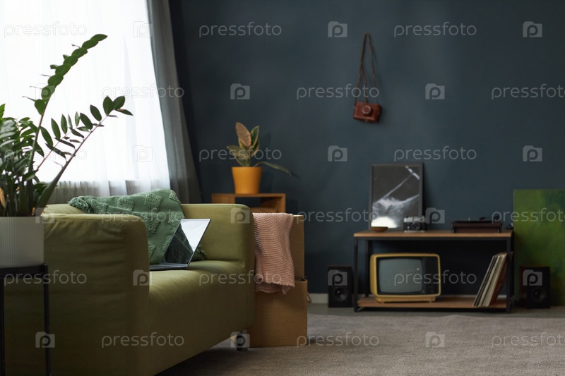 Уютная гостиная с зеленым диваном и горшковыми растениями