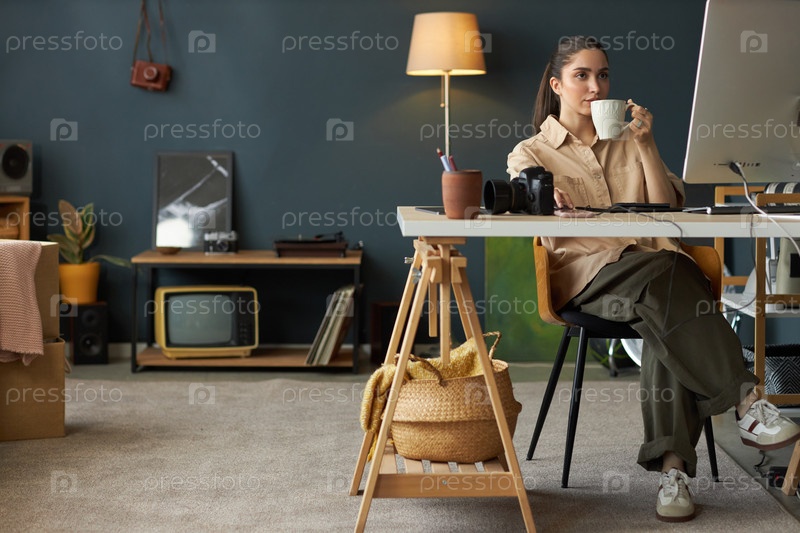 Женщина, работающая в домашнем офисе с чашечкой кофе