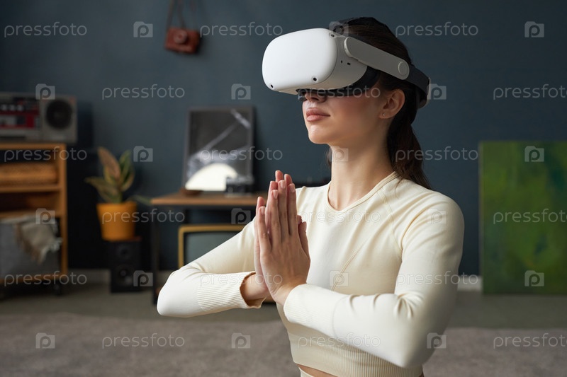 Женщина, практикующая медитацию с помощью гарнитуры виртуальной реальности