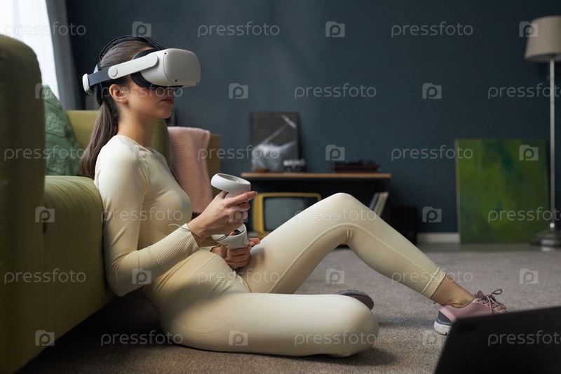 Женщина, сидящая на полу и играющая в игру виртуальной реальности