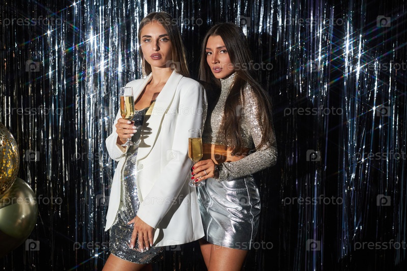 Празднование двух женщин, позирующих со стаканами шампанского