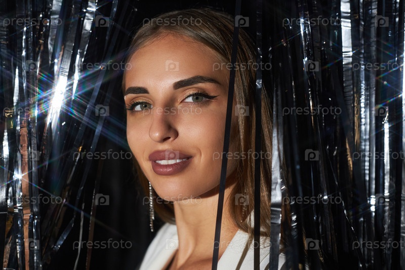 Портрет женщины, улыбающейся и смотрящей на камеру среди украшений