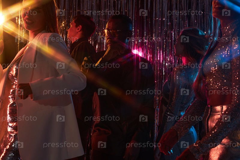 Празднование ночью с группой друзей, танцующих