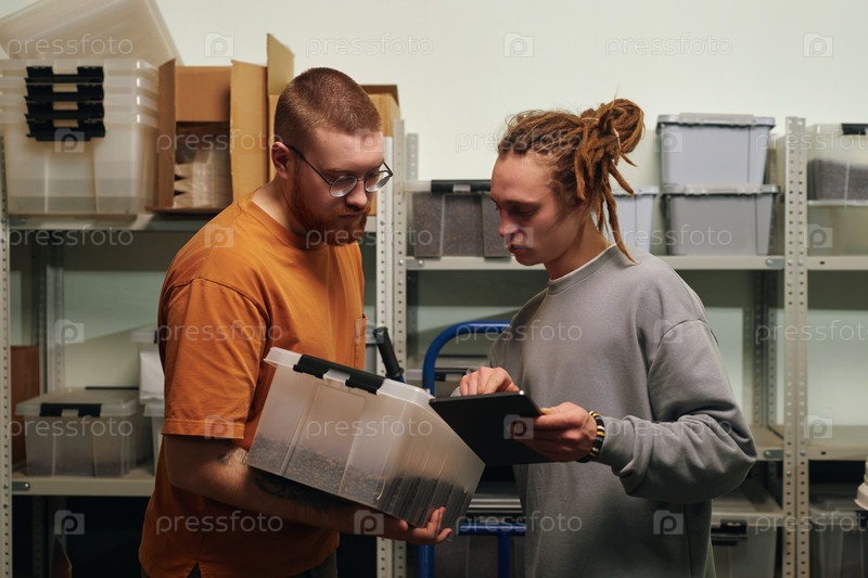 Мужчины, сравнивающие бренд кофе, написанный на коробке
