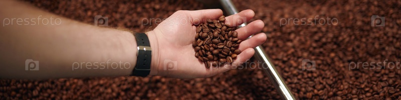 Заголовок с горсткой кофейных зерен в пальме