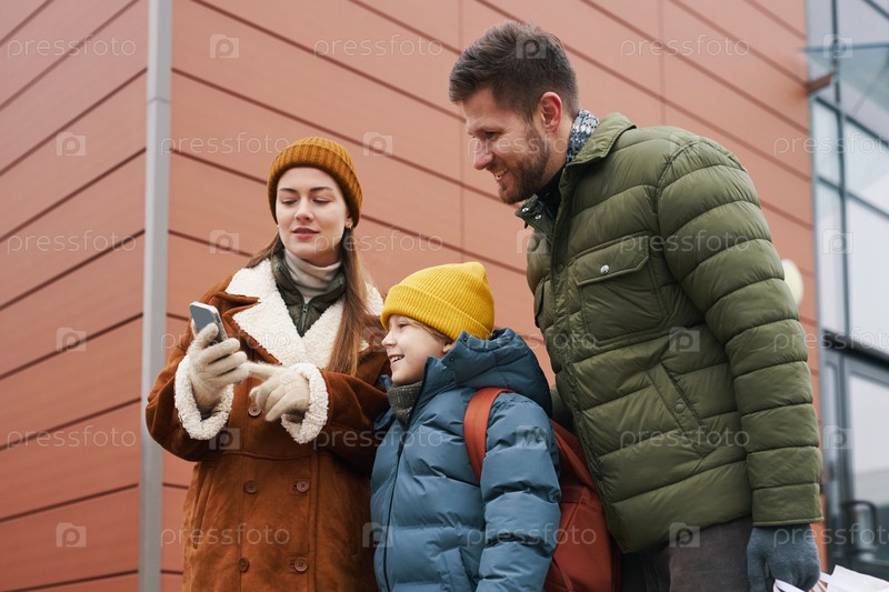 Семья, использующая смартфон снаружи современного здания
