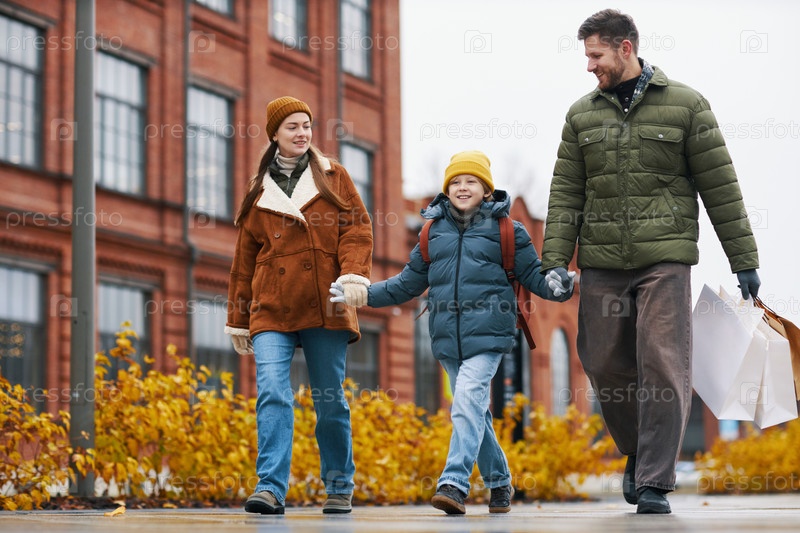 Семья наслаждается зимним днем покупок на открытом воздухе, улыбаясь тепло