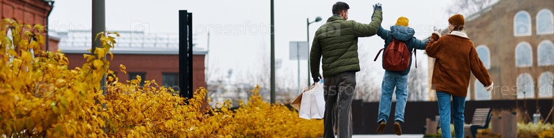 Отец рука об руку с ребенком и партнером ходят по улице