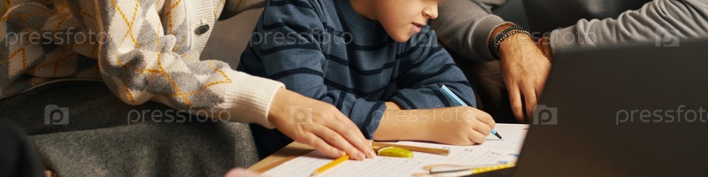 Ребенок учится с родителями дома на блокноте