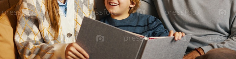Семья наслаждается книгой вместе в уютной гостиной
