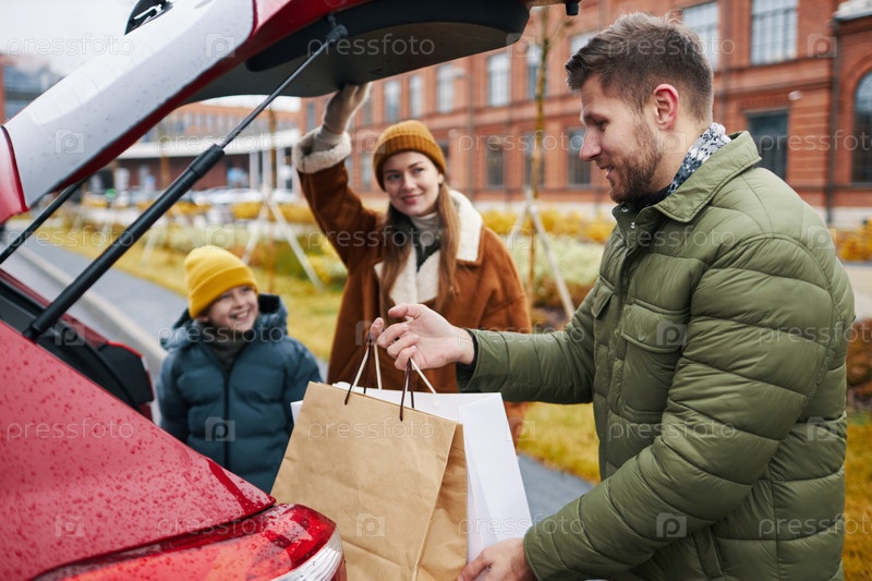 Семейная упаковка багажника автомобиля во время покупок на открытом воздухе