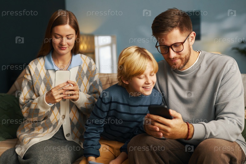 Улыбающаяся семья взаимодействует со смартфонами дома