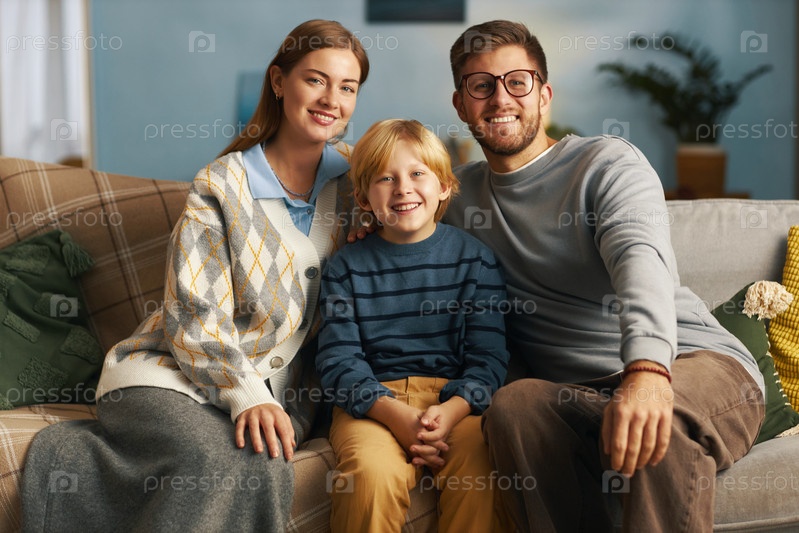 Улыбающаяся семья сидит на диване, наслаждаясь качественным временем вместе