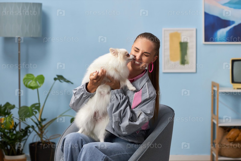 Улыбающаяся женщина сидит с пушистой белой кошкой на коленях