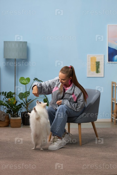 Молодая женщина играет с пушистой белой собакой в гостиной