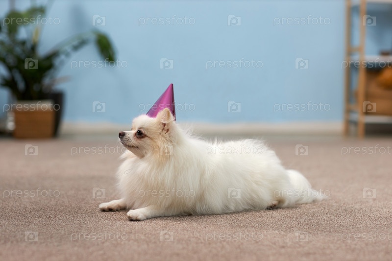 Пушистый Помераньян носит шляпу на ковре