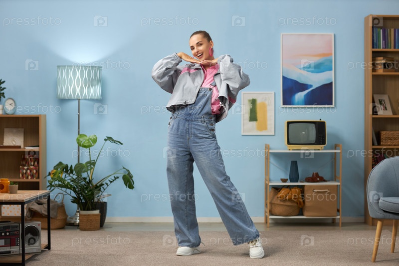 Танцующая молодая женщина в ярко освещенной гостиной