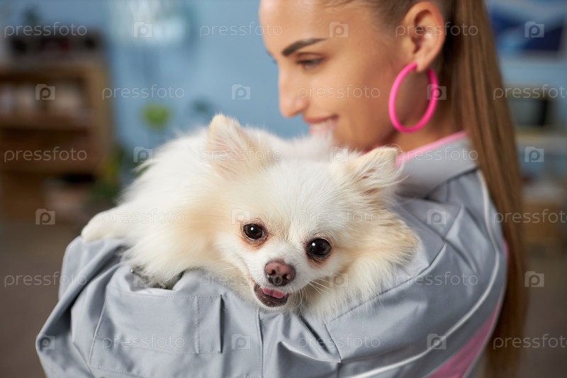Держит милого Померания, улыбаясь с радостью