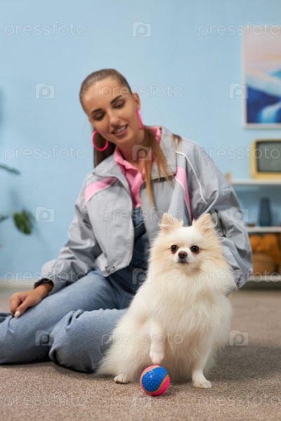 Женщина сидит на полу возле пушистой собаки, держащей мяч